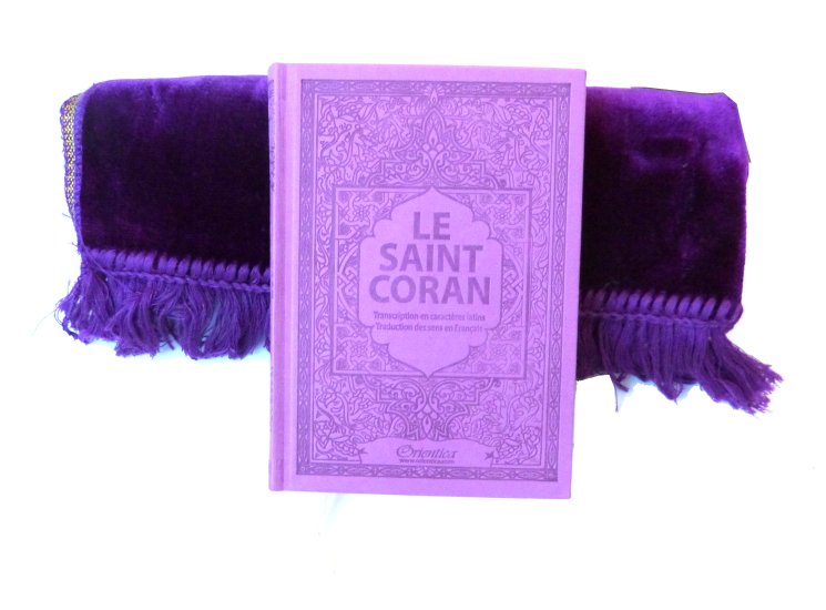 Pack cadeau pour femmes : Le Saint Coran (arabe-francais-phonetique) avec couverture cuir de luxe (mauve) + Tapis unis en velours couleur mauve