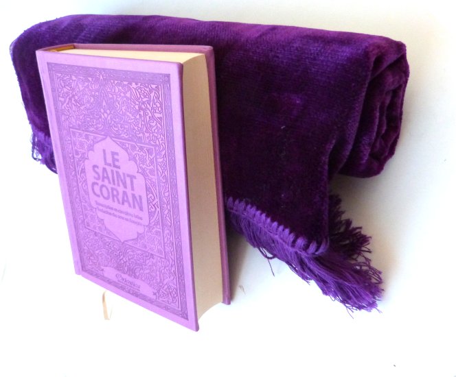 Pack cadeau mauve : Le Saint Coran (français/arabe/phonétique) + La Citadelle du musulman (Hisnul Muslim) + Tapis de prière en velours - REF. 23593 (39.00 €)