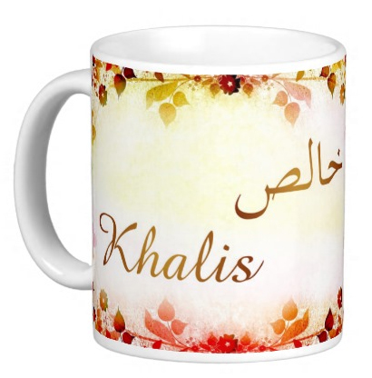 Mug avec le prénom "Khalis" écrit en français, en arabe (خالص) et calligraphié de façon artistique en arabe sur la partie droite.