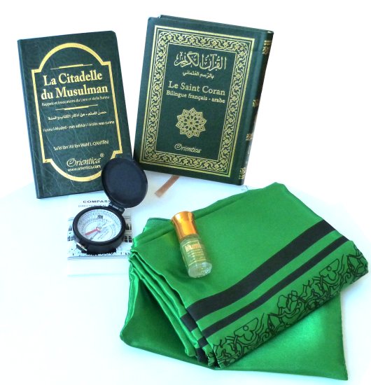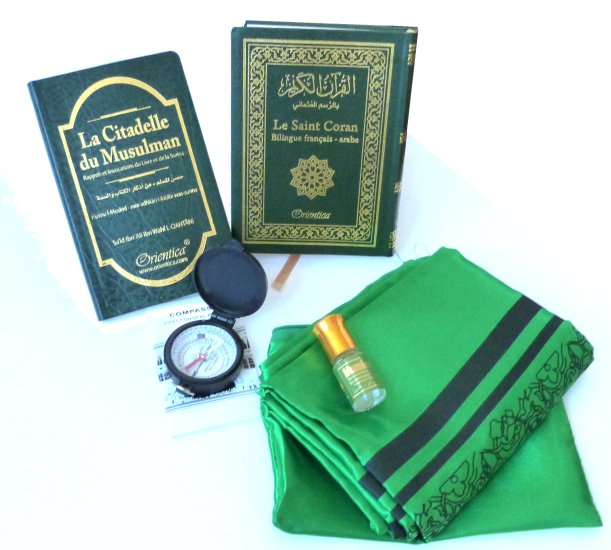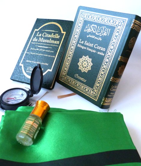 Pack Cadeau voyageur vert : Le Saint Coran Bilingue (arabe-français) + La Citadelle du musulman + Tapis de prière de poche et boussole + Parfum Musc (Cadeaux Islam) - REF. 23186 (17.90 €)