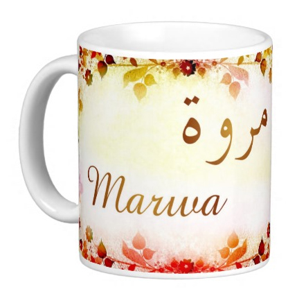 Mug avec le prénom "Marwa" écrit en français, en arabe (مروة) et calligraphié de façon artistique en arabe sur la partie droite.