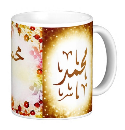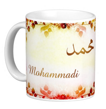 Mug avec le prénom "Mohammadi" écrit en français, en arabe (محمد) et calligraphié de façon artistique en arabe sur la partie droite.