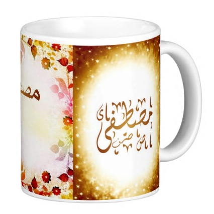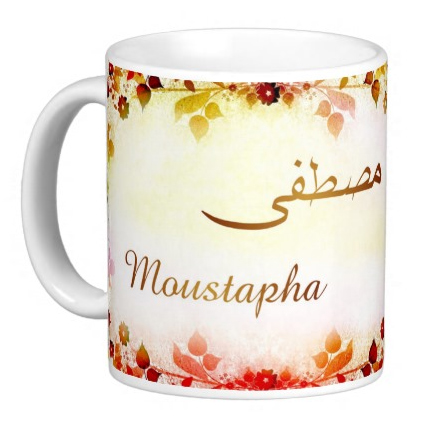 Mug avec le prénom "Moustapha" écrit en français, en arabe (مصطفى) et calligraphié de façon artistique en arabe sur la partie droite.