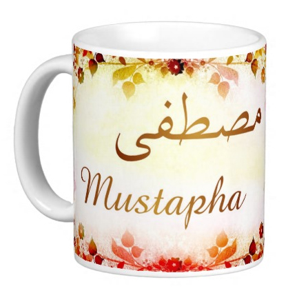 Mug avec le prénom "Mustapha" écrit en français, en arabe (مصطفى) et calligraphié de façon artistique en arabe sur la partie droite.