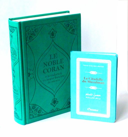 Cadeau pour musulman et musulmane : Le Saint Coran et la Citadelle du Musulman (français/arabe/phonétique) - Couleur vert-bleu - REF. 23602 (28.00 €)