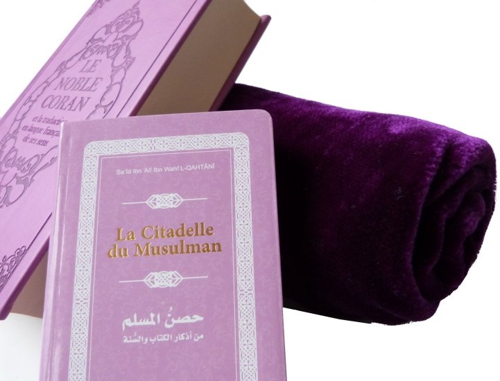 Pack Cadeau Mauve : Le Noble Coran avec couleurs Arc-en-ciel (Rainbow), La Citadelle du Musulman, Le Prophète Muhammad (SAW) et la femme, Tapis uni en velours, Diffuseur de parfum (assortis) - REF. 24134 (39.90 €) - En Promotion à 35.00 €