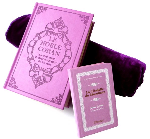 Pack cadeau : Le Noble Coran (bilingue français/arabe) mauve + La Citadelle Du Musulman mauve assortie + tapis de priere en velours - REF. 23256 (40.00 €)