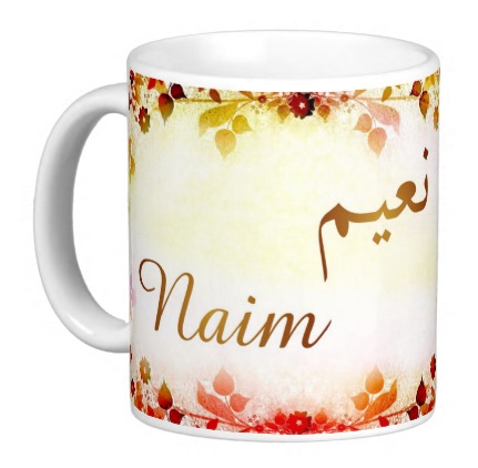 Mug avec le prénom "Naim" écrit en français, en arabe (نعيم) et calligraphié de façon artistique en arabe sur la partie droite.