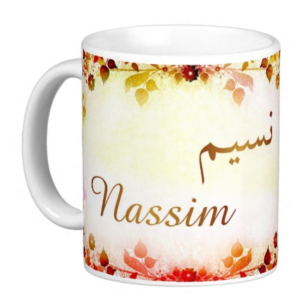 Mug avec le prénom "Nassim" écrit en français, en arabe (نسيم) et calligraphié de façon artistique en arabe sur la partie droite.