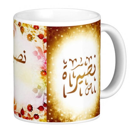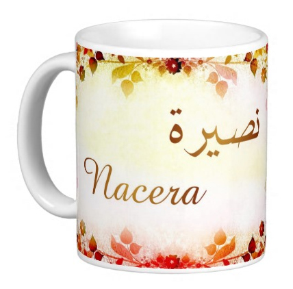 Mug avec le prénom "Nacera" écrit en français, en arabe (نصيرة) et calligraphié de façon artistique en arabe sur la partie droite.