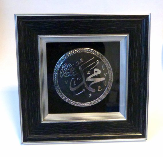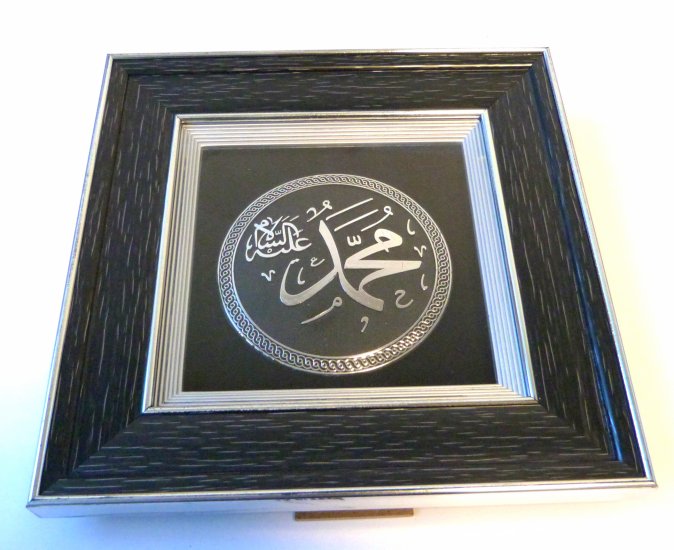 Tableau en bois argenté avec la calligraphie du nom du Prophète Mohammed (sallallahou 'alayhi wassalam). Deux positions possibles suspendue ou posé sur un meuble.
