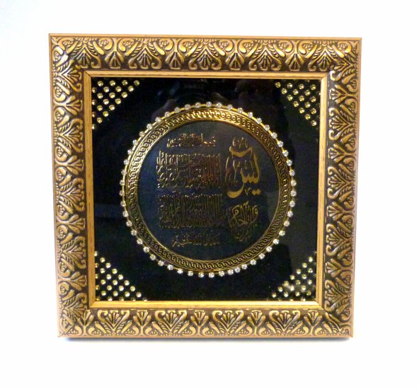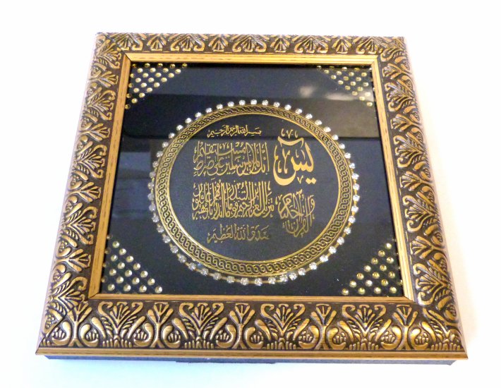 Très beau tableau (20 x 20 cm) en bois doré et décoré de strass. Au centre le début de la sourate Ya-Sin y est inscrite.
