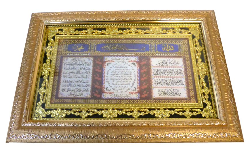 Tableau islamique en bois avec reliefs doree contenant le Verset du Trone (Ayatoul Koursi) et invocations de protections