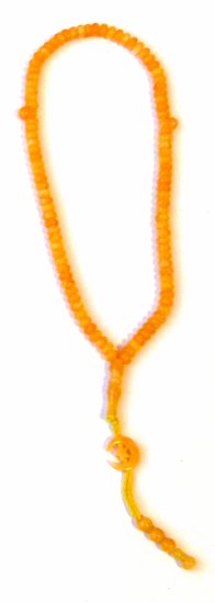 Grande Sebha à 99 grains en plastique de couleur ocre avec à son extimité le croissant musulman.