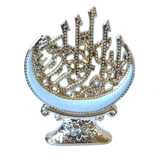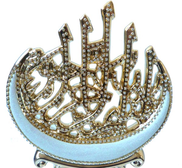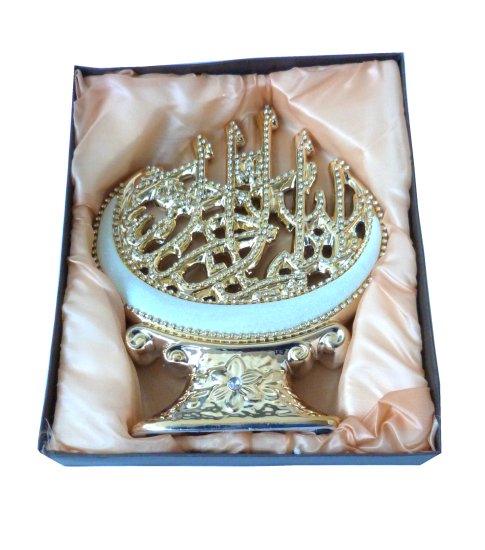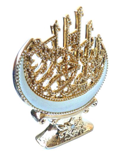 Objet décoratif en porcelaine doré avec la basmalla (Bismillahi Rahmâni Rahîm) calligraphiée et décorée de diamants blancs.