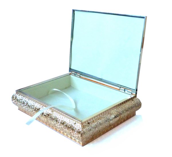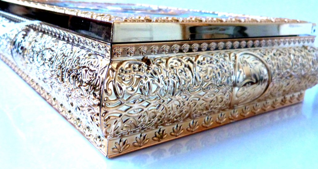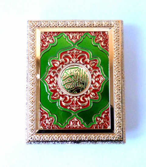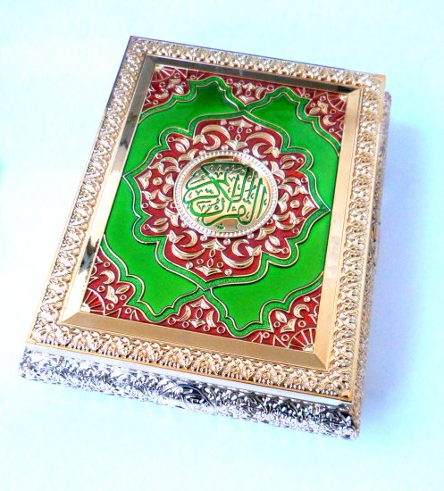 Coffret métallique doré de luxe pour Coran avec jolies décorations colorées. Au centre il est inscrit en arabe Le Saint Coran القرآن الكريم.