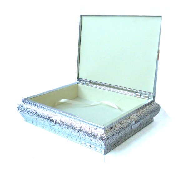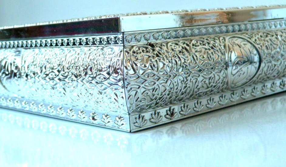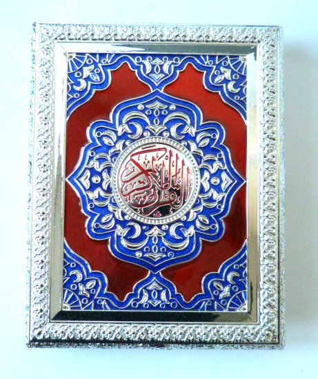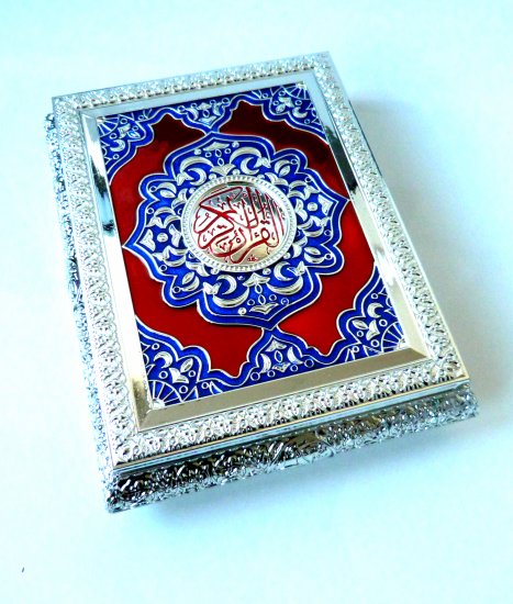 Coffret métallique argenté de luxe pour Coran avec jolies décorations colorées et inscription en arabe "Le Saint Coran" القرآن الكريم au centre.