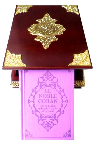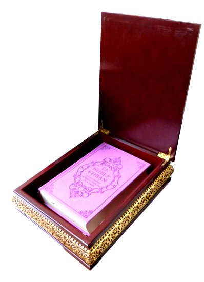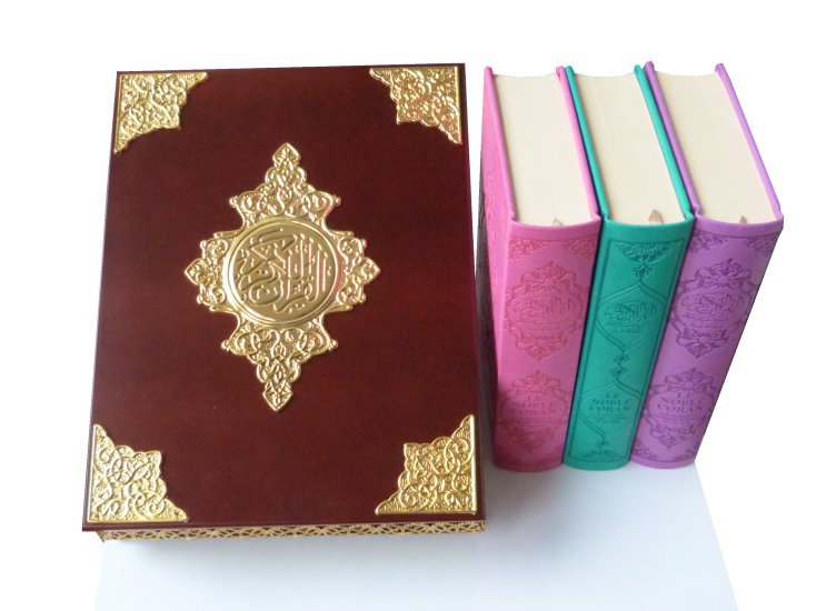 Noble Coran avec sa couverture en cuir, traduit en langue française avec son coffret doré de luxe assorti.