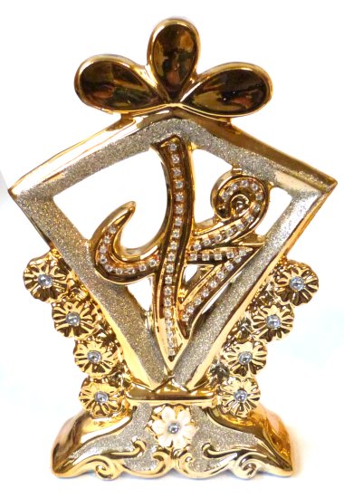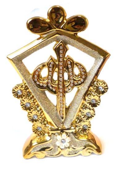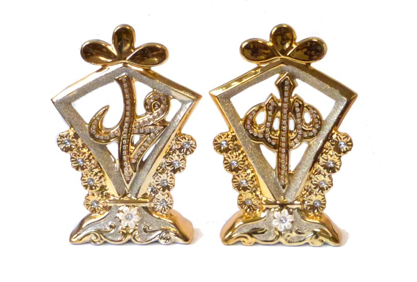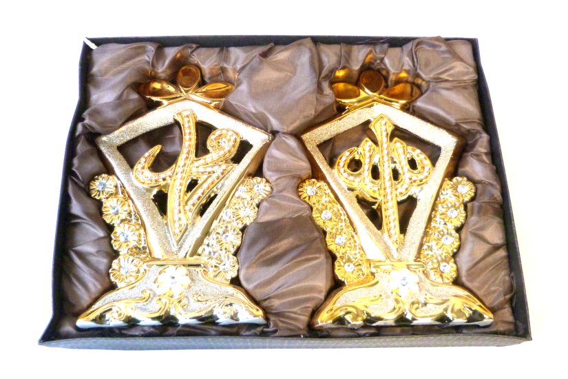 Ensemble de 2 pièces décoratives en porcelaine dorées avec inscription Allah et Mohammed décorées de diamants blancs.