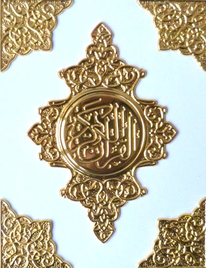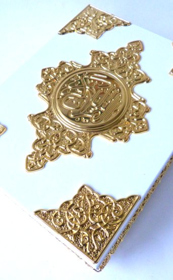 Sur le haut du coffret est inscrit la calligraphie métallique dorée "Al-Qur'ân Al Karîm" (Le Saint Coran) en arabe.