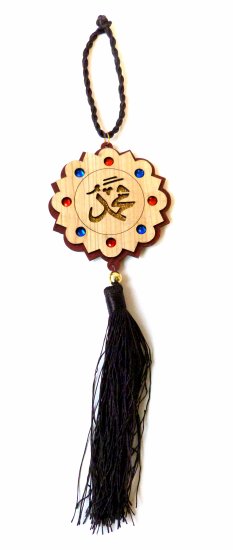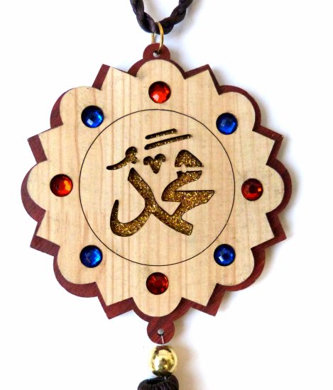 Pendentif en bois gravé des inscriptions calligraphiques Allah et Mohammed saw, et entouré de petits diamants bleus et verts. A accrocher par exemple dans la voiture...
