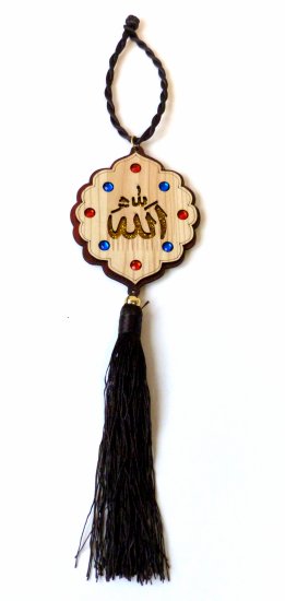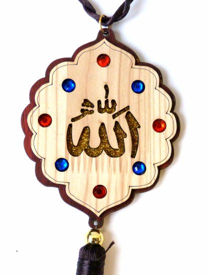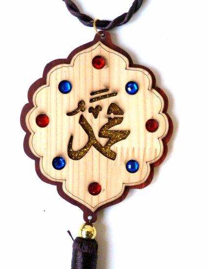 Pendentif en bois gravé des inscriptions calligraphiques Allah sur une face et Mohammed (saw) sur l'autre face, et entouré de petits diamants bleus et verts. A accrocher par exemple dans la voiture...
