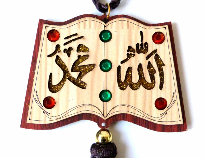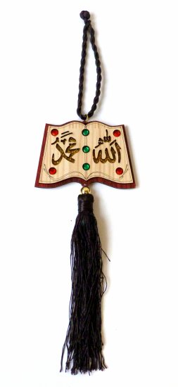 Pendentif en bois sous forme de livre ouvert, gravé des inscriptions calligraphiques Allah et Mohammed saw (avec fond en paillettes dorées), et entouré de diamants rouges et verts. A accrocher par exemple dans la voiture...