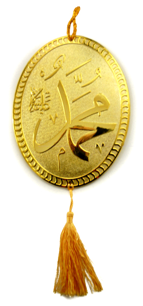 Pendentif décoratif doré avec le nom du Prophète Muhammad (PBDSL) calligraphié en arabe, en relief.