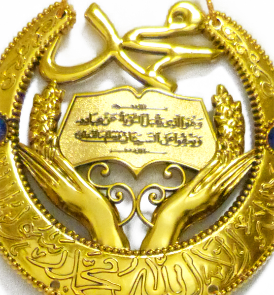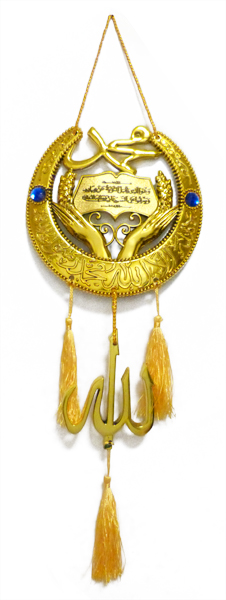 Pendentif (fanion) décoratif doré comportant le verset 25 de la sourate 42 (Ash-Shûrâ) qui concerne l'acceptation du repentir et une inscription "Muhamed" apposée juste au dessus du verset. Doté d'ornements suspendus en dessous dont des pompons et une inscription "Allah" ainsi qu'une languette de suspension par dessus.
