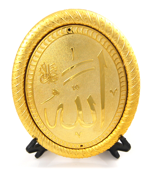 Tableau en forme ovale doré avec le nom d'Allah en calligraphie sur trépied.