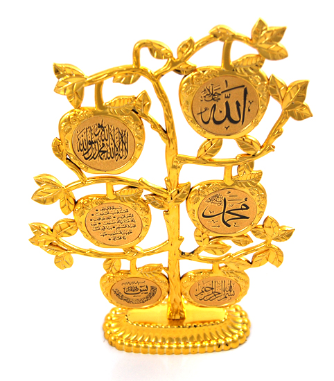 Arbre décoratif doré avec Sourate Al Fâtiha, Sourate Yâcîn, la Basmala (بسم الله الرحمن الرحيم), la chahada (لا إله إلا الله, محمد رسول الله), ainsi que le nom d'Allâh, et le nom du prophète Mouhammad (PBSL).