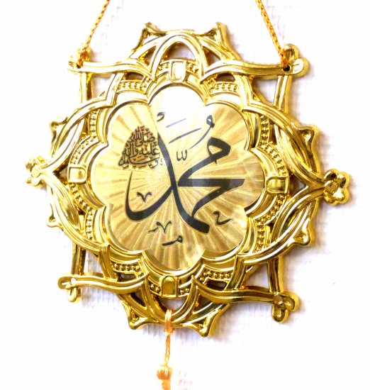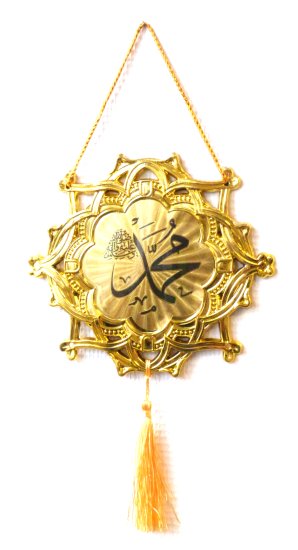 Pendentif islamique décoratif doré avec la calligraphie du nom du Prophète de l'Islam "Mohammed (Paix et Bénédiction sur lui)".