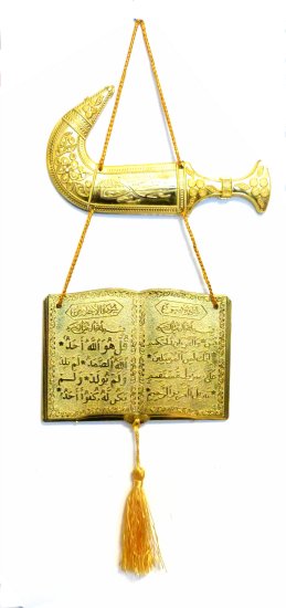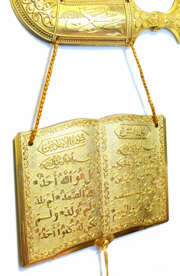 Pendentif islamique décoratif doré le début de "Sourate yassine" et "Sourate Al-Ikhlass".