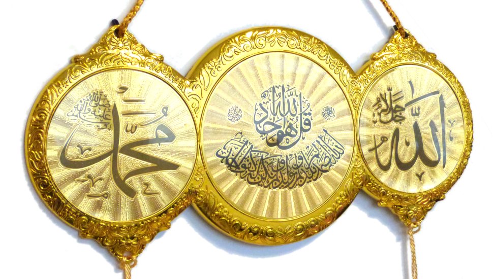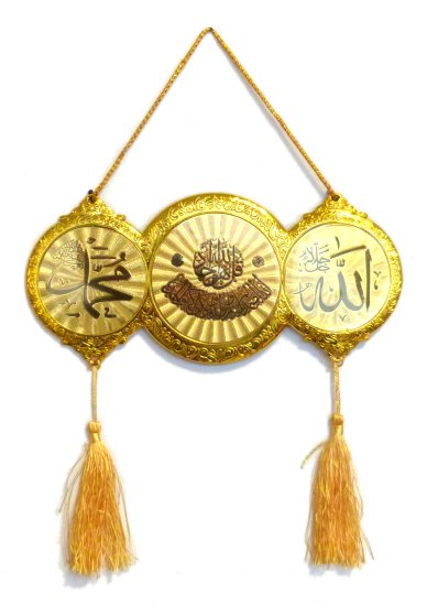 Pendentif doré de décoration avec Le nom d'ALLAH, le Nom de prophète Mohammed (Saw) et Sourate Al-Ikhlass.