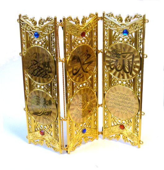 Objet décoratif doré sous forme paravent contenant plusieurs inscriptions calligraphiques :