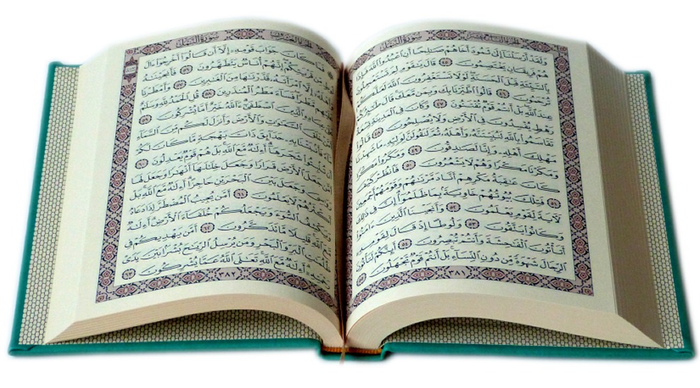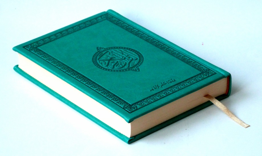 Coran de luxe avec couverture de couleur bleu-vert de type cuir, très doux au toucher, agréable à manier et ne ramasse pas la poussière.