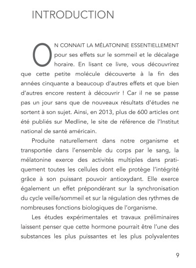 En étudiant ses propriétés, les chercheurs ont découvert un monde de possibilités. De structure moléculaire inaltérable, elle est produite selon un rythme immuable, jour/nuit. Elle est le chef d'orchestre du sommeil. Tranquillisante, elle favorise merveilleusement l'endormissement. Elle stimule l'immunité, donc protège des maladies ; elle calme l'anxiété ; antioxydant majeur, elle protège l'ensemble de l'organisme et particulièrement le cœur ; elle boosterait l'activité sexuelle ; liée au temps, elle permet de gérer le décalage horaire, ce qui explique son succès auprès des personnels navigants. Le taux de mélatonine dans l'organisme diminuant dramatiquement avec l'âge, se supplémenter à partir de la cinquantaine peut être la solution pour améliorer votre sommeil et votre bien-être. Une nouvelle collection pour vous Vous êtes à la recherche de solutions naturelles pour votre équilibre, votre bien-être et votre santé. Les petits ouvrages de la collection En savoir plus, simples et pratiques, vont droit au but : ils ne traitent que d'un nutriment ou une plante, celui ou celle qui justement vous intéresse. Vous trouvez ainsi ce que vous cherchez sans vous perdre dans une littérature superflue ou ardue.