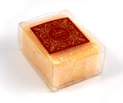Carré de musk solide (jamid) "Noor Al Haramain" (la lumière des deux lieux saints), dans une boite en plastique transparente et rigide.
