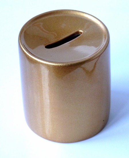 Tirelire en céramique. Produit de couleur or. Fente sur la haut pour déposer votre monnaie. Ouverture par la bas avec bouchon en caoutchouc transparent (3cm de diamètre). Idée cadeau.