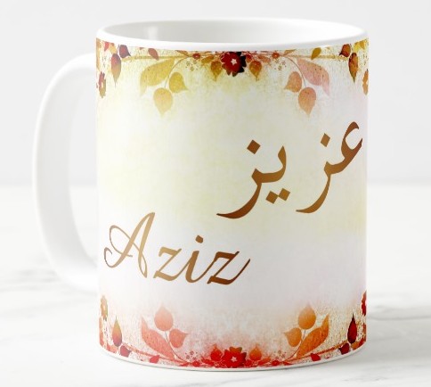 Mug avec le prénom "Aziz" écrit en français, en arabe (عزيز) et calligraphié de façon artistique en arabe sur la partie droite.