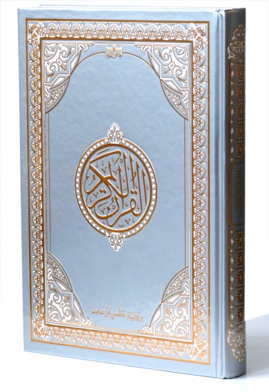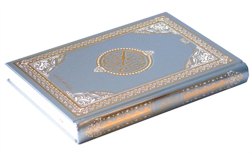 Coran de luxe avec couverture de couleur gris et dorée avec décorations dorées en relief, agréable à manier et ne ramasse pas la poussière.