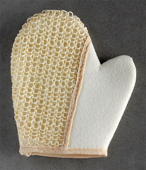 Gant pour le bain, avec couche en fibre naturelle exfoliante avec une rugosité optimale (ni trop rugueuse, ne trop lisse) pour aider à la desquamation des peaux mortes.