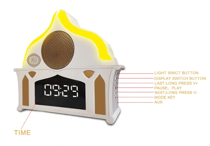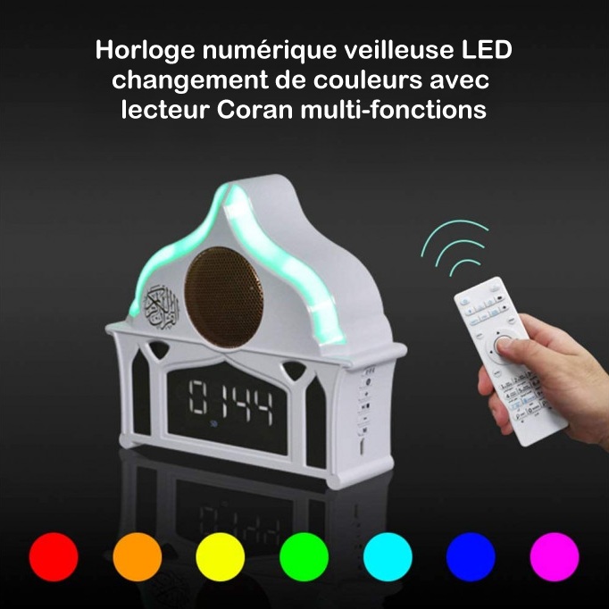 Lampe Veilleuse Coranique + horloge LED numérique avec Haut-parleurs, Bluetooth traduction en plusieurs langues avec les plus grands Récitateurs de Coran.