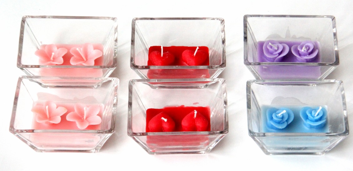 Chaque bougie double est constitué de deux bougies avec différents motifs (fleurs, coeurs...)