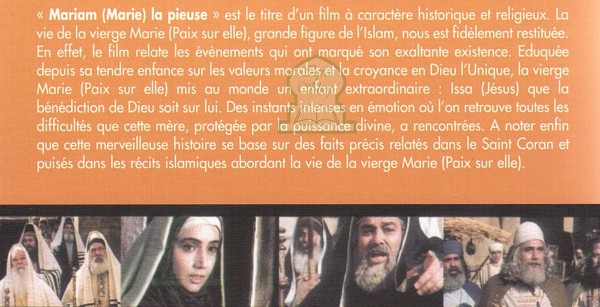 "Mariam (Marie) la pieuse " est le titre d'un film à caractère historique et religieux. La vie de la vierge Marie (Paix sur elle), grande figure de l'Islam, nous est fidèlement restituée. En effet, le film relate les évènements qui ont marqué son exaltante existence. Éduquée depuis sa tendre enfance sur les valeurs morales et la croyance en Dieu l'Unique, la vierge Marie (Paix sur elle) mis au monde un enfant extraordinaire : Issa (Jésus) que la bénédiction de Dieu soit sur lui. Des instants intenses en émotion où l'on retrouve toutes les difficultés que cette mère, protégée par la puissance divine, a rencontrées. A noter enfin que cette merveilleuse histoire se base sur des faits précis relatés dans le Saint Coran et puisés dans les récits islamiques abordant la vie de la vierge Marie (Paix sur elle).