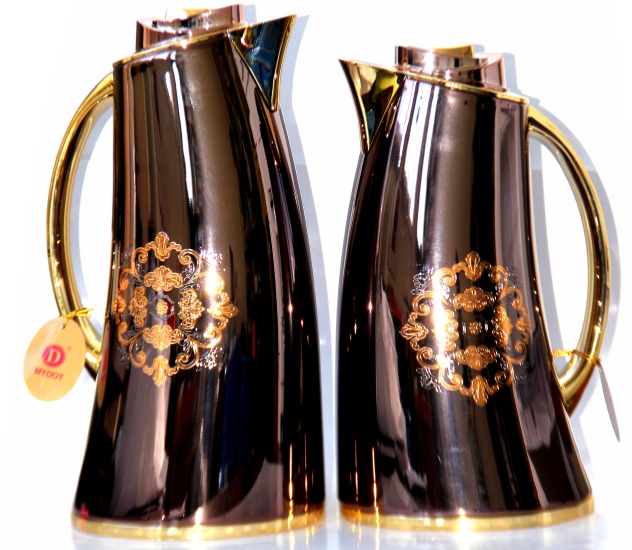 Lot de deux magnifiques thermos chromées assortis de 1 L chacune avec des parties dorées et une jolie gravure décorative dorée sur la façade.