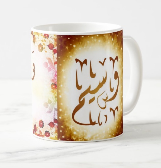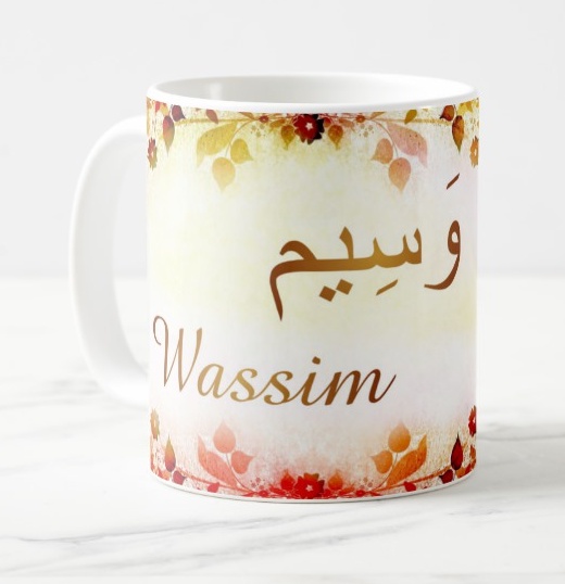 Mug avec le prénom "Wassim" écrit en français, en arabe (وسيم) et calligraphié de façon artistique en arabe sur la partie droite.