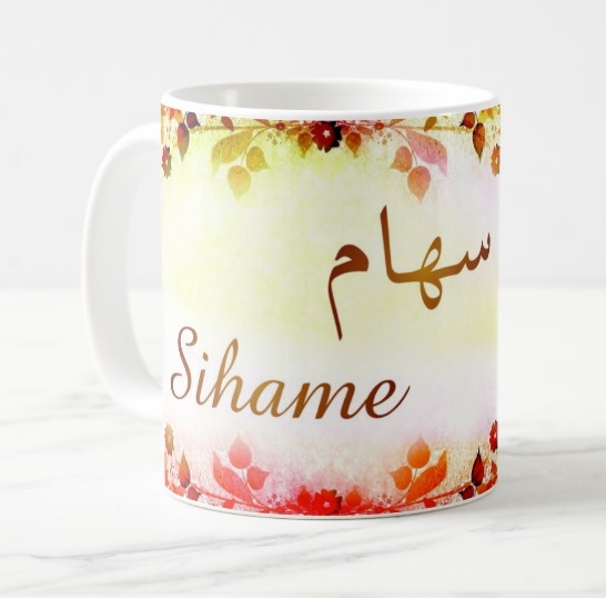 Mug avec le prénom "Sihame" écrit en français, en arabe (سهام) et calligraphié de façon artistique en arabe sur la partie droite.