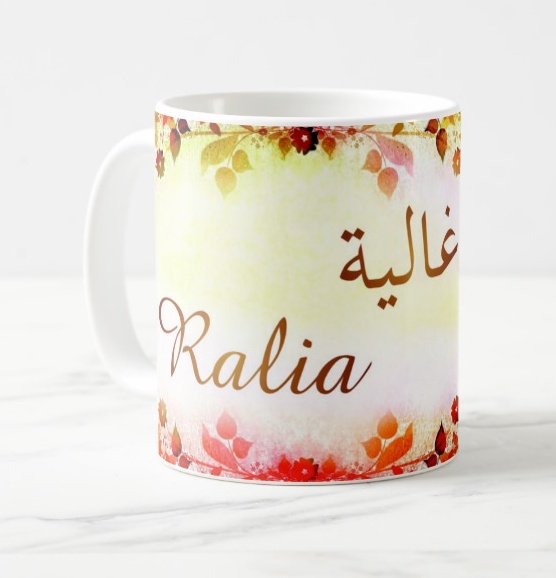 Mug avec le prénom "Ralia" écrit en français, en arabe (غالية) et calligraphié de façon artistique en arabe sur la partie droite.