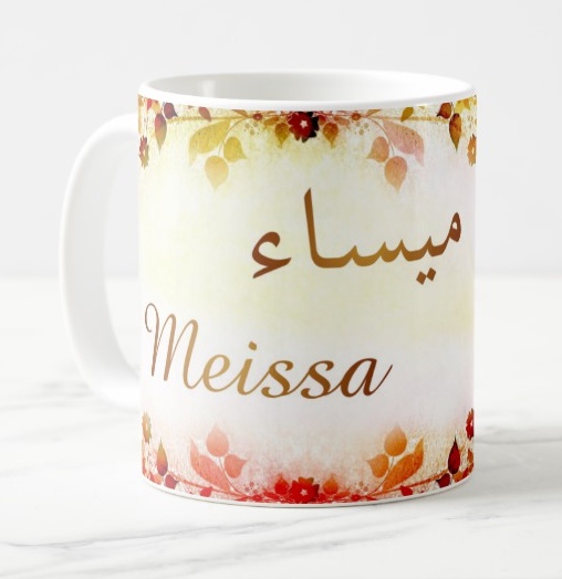 Mug avec le prénom "Meissa" écrit en français, en arabe (ميساء) et calligraphié de façon artistique en arabe sur la partie droite.